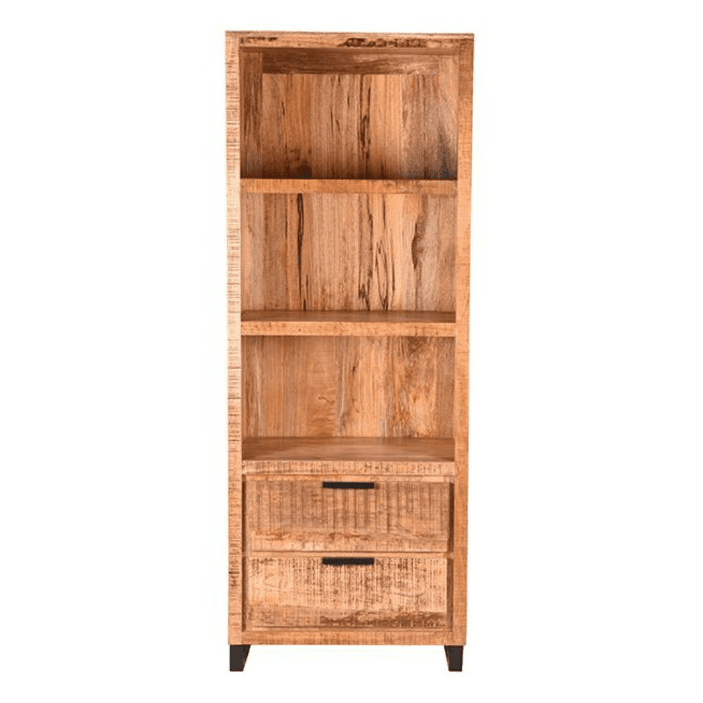 This tall bookcase encompasses open and enclosed storage in a fusion of metal with a bleached…